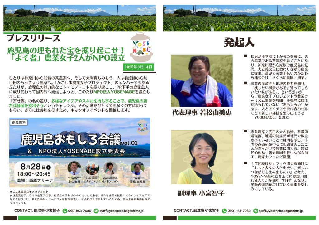 県外出身の女性二人が、鹿児島の魅力的な「ヒト・モノ・コト」を掘り起こし、国内外へ発信することを目的に、NPO法人YOSENABEを設立されました。
