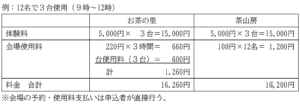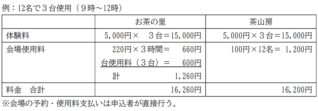 お茶の里 交流室 半分 220 円 /時間 全面 440 円 /時間 台(ホイロ)使用料 200 円 /台