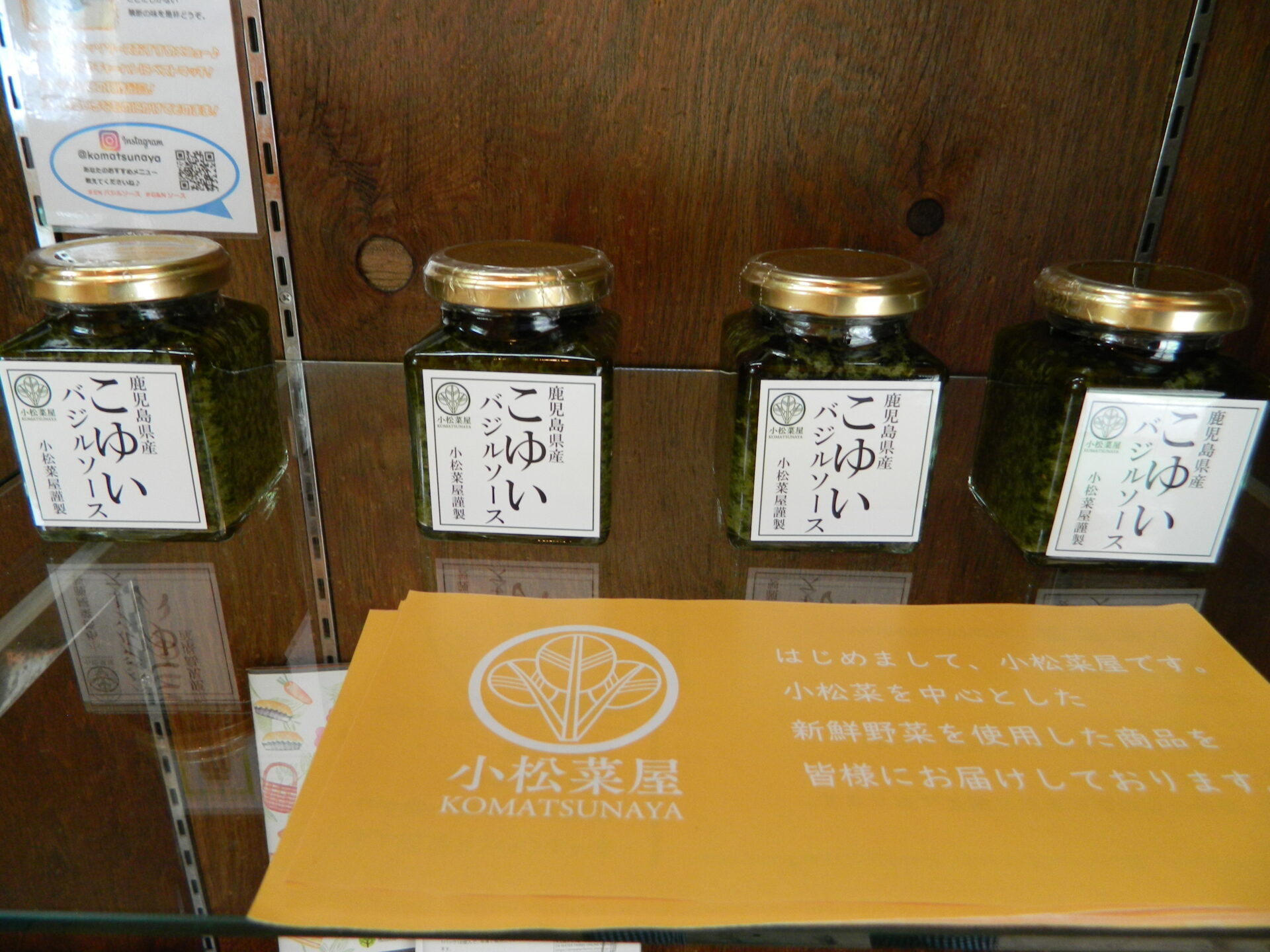 小松菜をメインに、葉物野菜やハーブを水耕栽培しているEN WATER FARMS。生産した新鮮な野菜類を生かした多彩な加工品を、県道221号線沿いの「小松菜屋」で販売。料理の幅が広がる小松菜ソースやバジルソース、ヘルシーな小松菜餃子などが並ぶ。